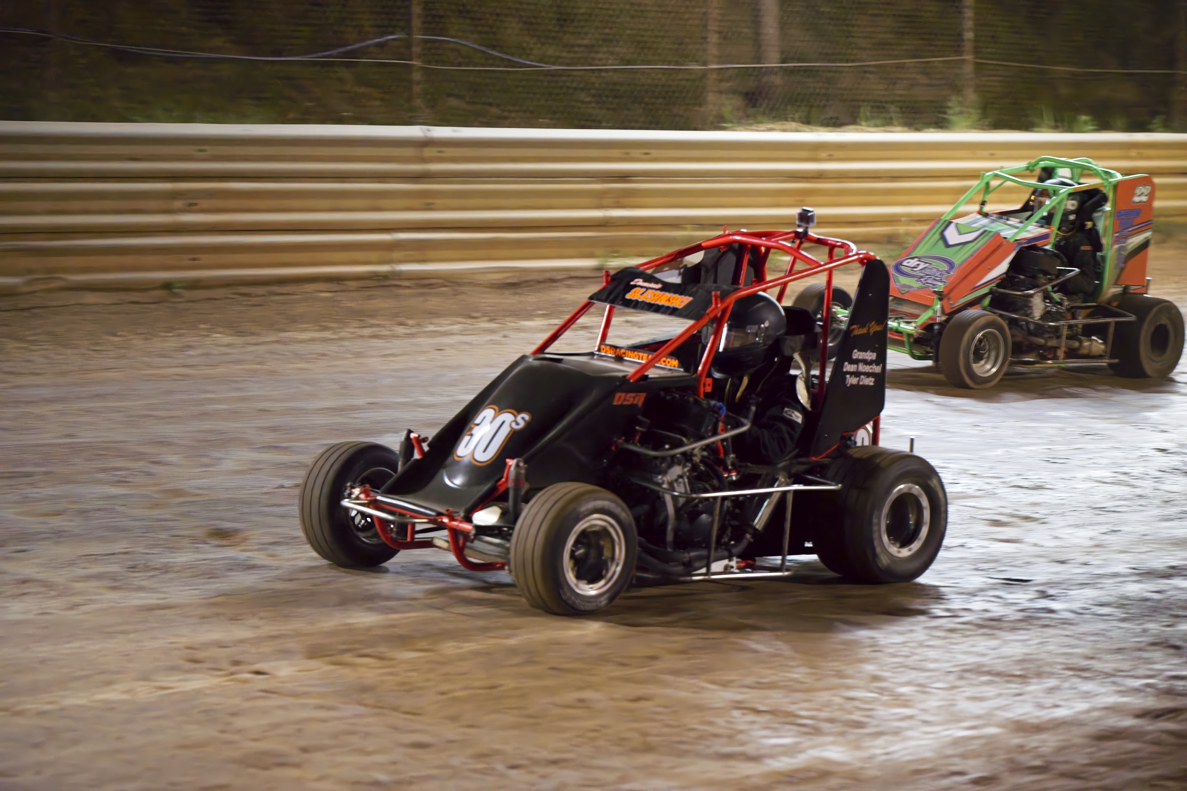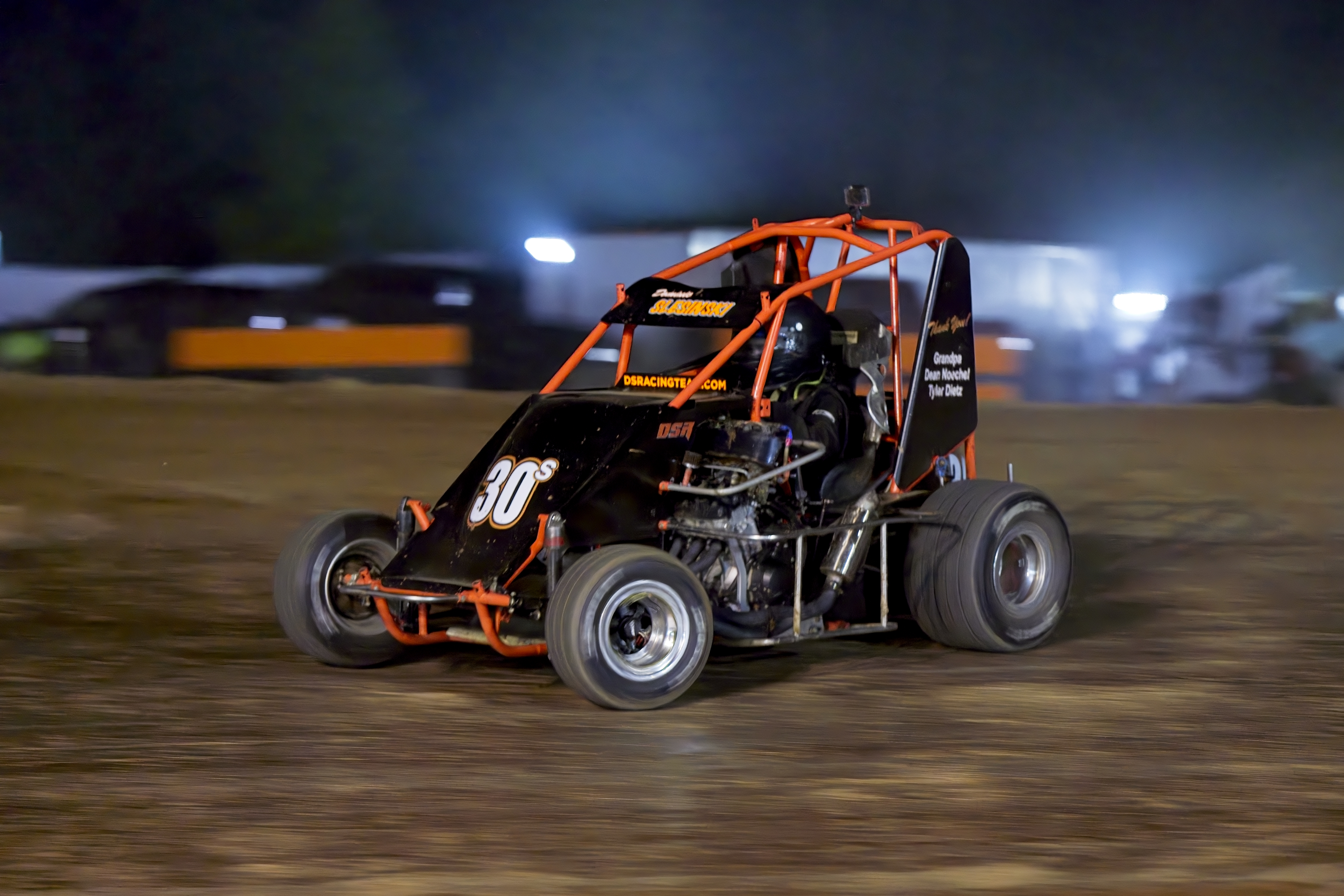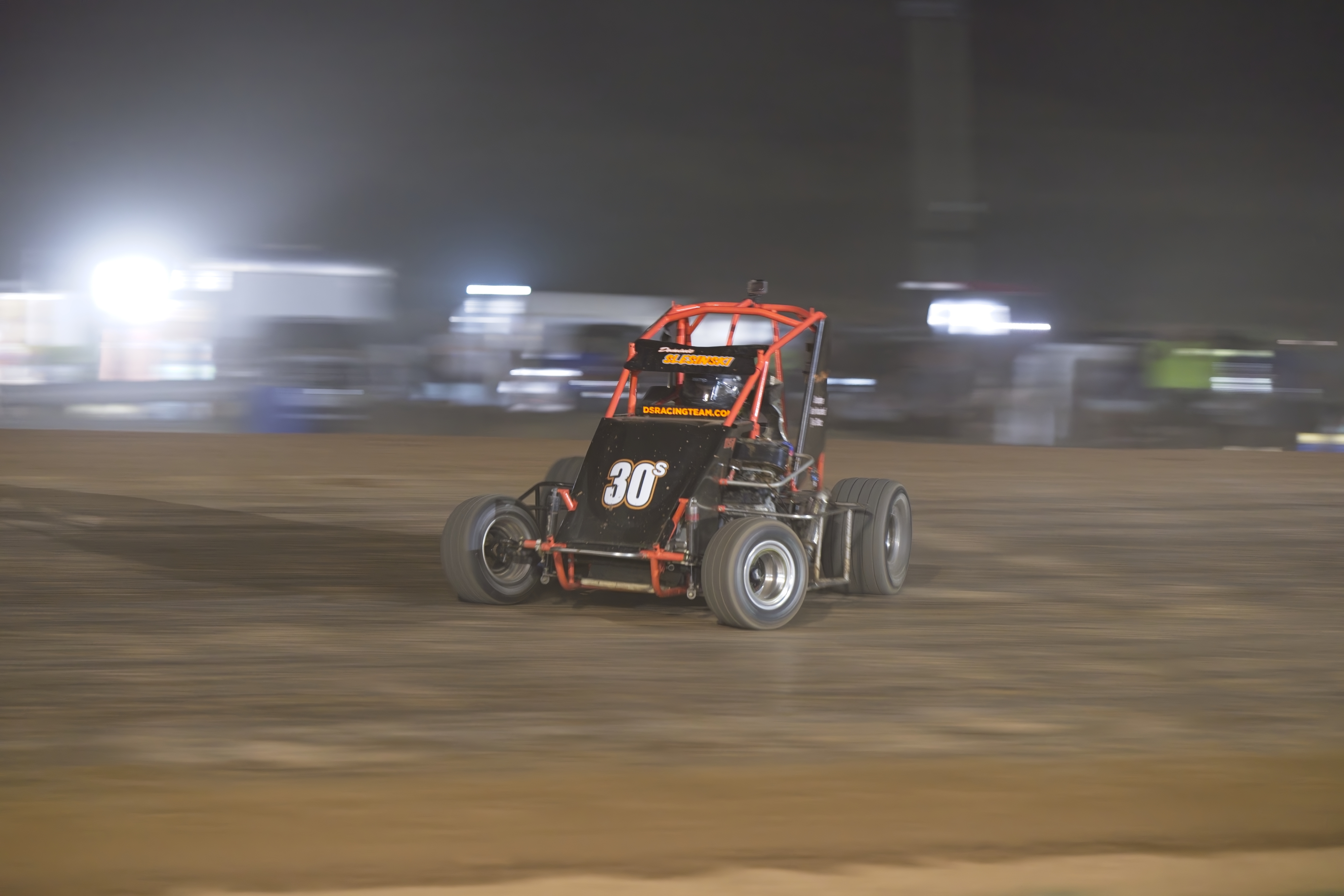 In the feature race, Dominic was up on the wheel, battling fiercely for positions. He spun out while attempting a pass coming out of turn 4 . This dropped him to the rear of the field for the restart with only five or six laps remaining.