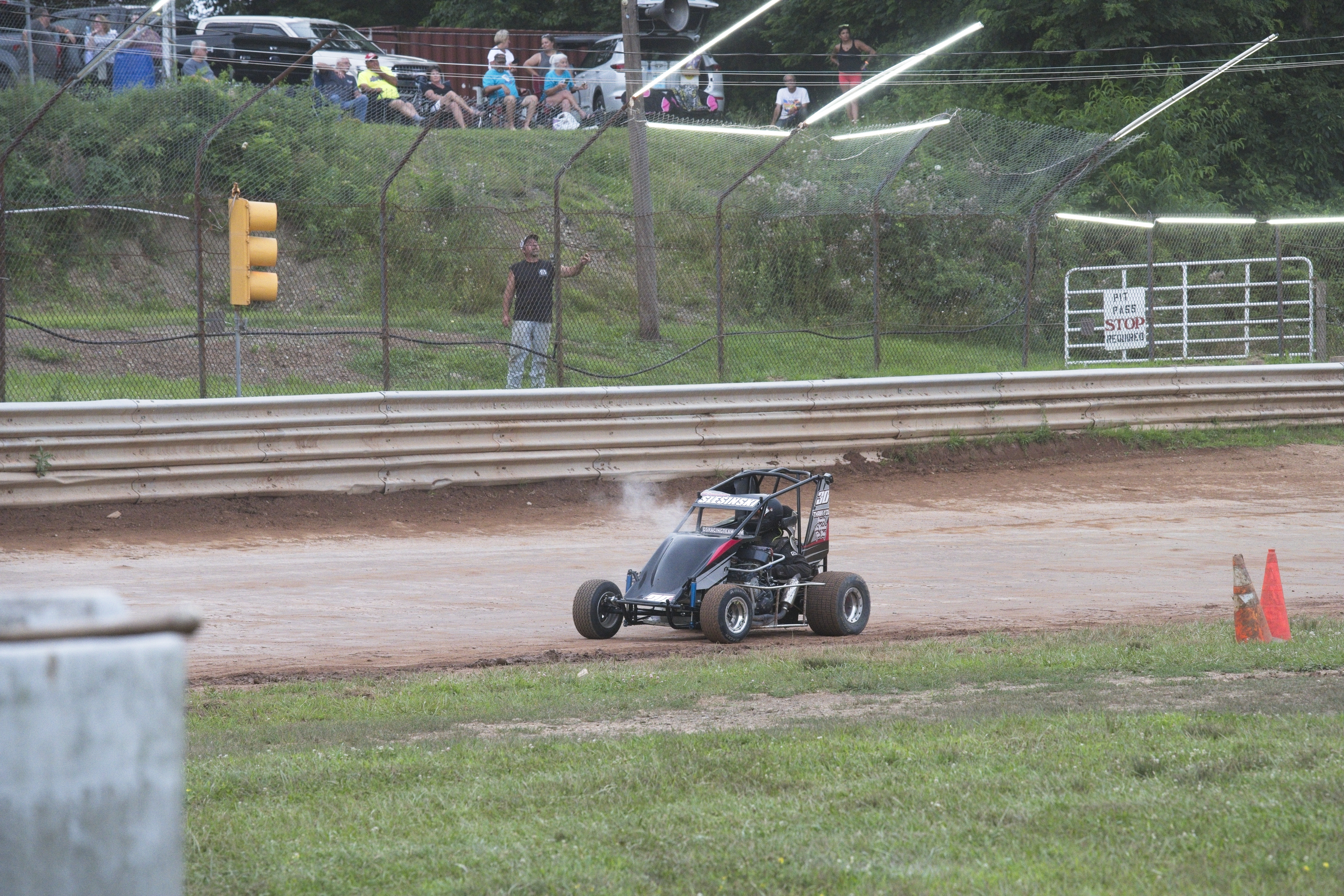 While slowing down for the yellow, smoke poured from the car. The temperature spiked. Rather than risk major damage, Dominic made the tough but smart call to shut it down and was pushed back to the trailer. We logged a DNF for the heat. While nothing obvious looked out of place, we suspected something in the water pump failed during the earlier chain incident.